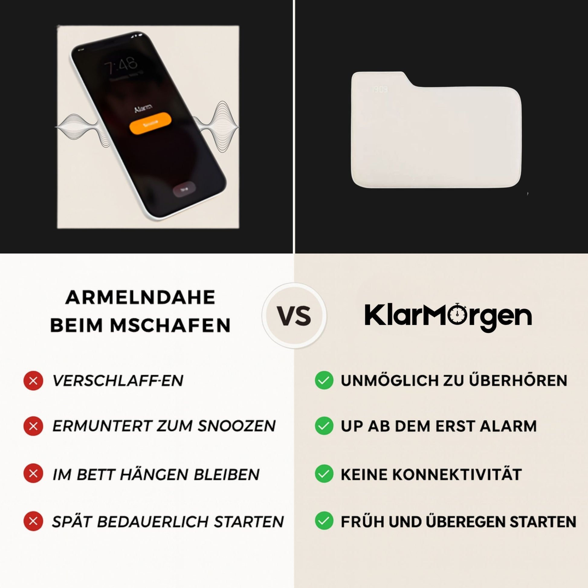 Ja. Der Alarm stoppt erst, wenn Sie mindestens 3 Sekunden auf der Matte stehen. Dieser kurze Impuls durchbricht die Schlafträgheit – Snoozen oder Zurück-ins-Bett ist praktisch ausgeschlossen.